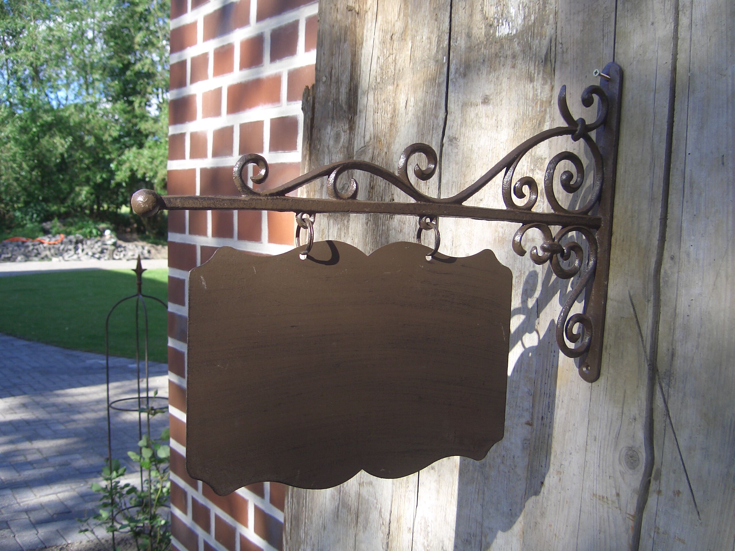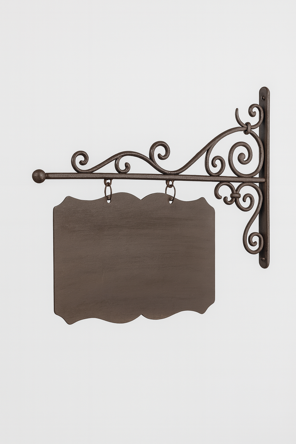 Edles Schild mit Wandhalter, kunstvoll aus Schmiedeeisen gefertigt und im Antiklook lackiert.